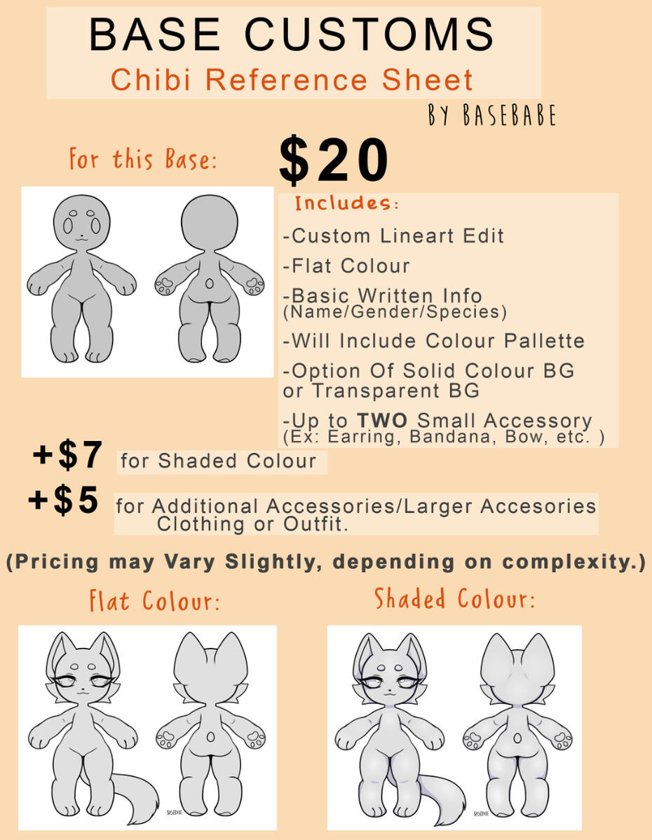 Small Chibi Base | BaseBabe | $20 | +$7 | +$5 | Each Custom Made with this Base has Line Edits Included in Base Price | +$2-$10 (varies) | +$2 per Revision |